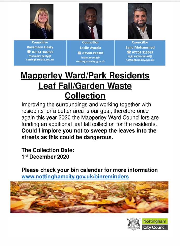 Our Chair, Sue Clague has been in touch with our local councillor regarding leaf collections. Please find the response below. After seeking clarification from our officers below is a response I received about the leaf collection in Mapperley Park :-“Dear Mapperley Park Residents”We have teams in Mapperley Park as we speak (and they have been for the last week now). We currently have the Mainline sweeper (the big 12 tonnes sweeper) and two transit vans with two colleagues in each of them (they are using the blowers and shovels to clear the leaves). That’s five members of staff dedicated to Mapperley Park leaf clearance all day, every working day.We still have our regular / routine work that we are having to carry out all over the wards, in addition to the help / assistance we are offering to Domestic Waste to ensure household bins are emptied daily.With Social Distancing, we can only have a maximum of two colleagues in a van (regardless of how big the van is) and close to half of the workforce are non-drivers, so we cannot operate with four or more colleagues in one van as we used to previously.With the new lockdown and the announcement that those classed as clinically extremely vulnerable will be asked to stay at home, we have lost some staff and we also have those who get in touch who have been asked to Self-Isolate (which in some cases takes them out of action for 14 days). When I last checked on Thursday last week, as a Service, we had c40 colleagues off sick for either Testing Positive for COVID, self-isolating for being in contact or for having symptoms, and those off long term sick.This is the current state of play. I just wanted you to have the full overview of some challenges we are going through but please be assured that we are working through these challenges and regardless of how bad things may get, we will endeavour to maintain the current resource of five colleagues in the Mapperley Park area as a minimum.I know that we are on the last stretch of Garden Waste collection, so I’m hopeful we will get some more staff back close to the end of the month and the additional resource will be drafted in to assist in this area.Finally, I am in the middle of getting the list of streets we have visited and what is outstanding. I will share this list and also a proposal on what more we can do so that you have an overall view which may assist in the letter to your residents.”As you can appreciate the present situation in the country and city are very challenging, but we are going to make every effort to provide residents with a the best service we can provide with the resources at our disposal. Please feel free to share this on the Facebook Group and the flyer for the extra leaf collection that we have funded out of our Councillor budgets again for this year.