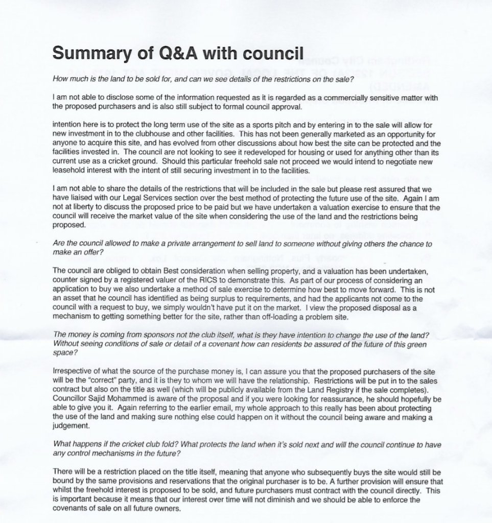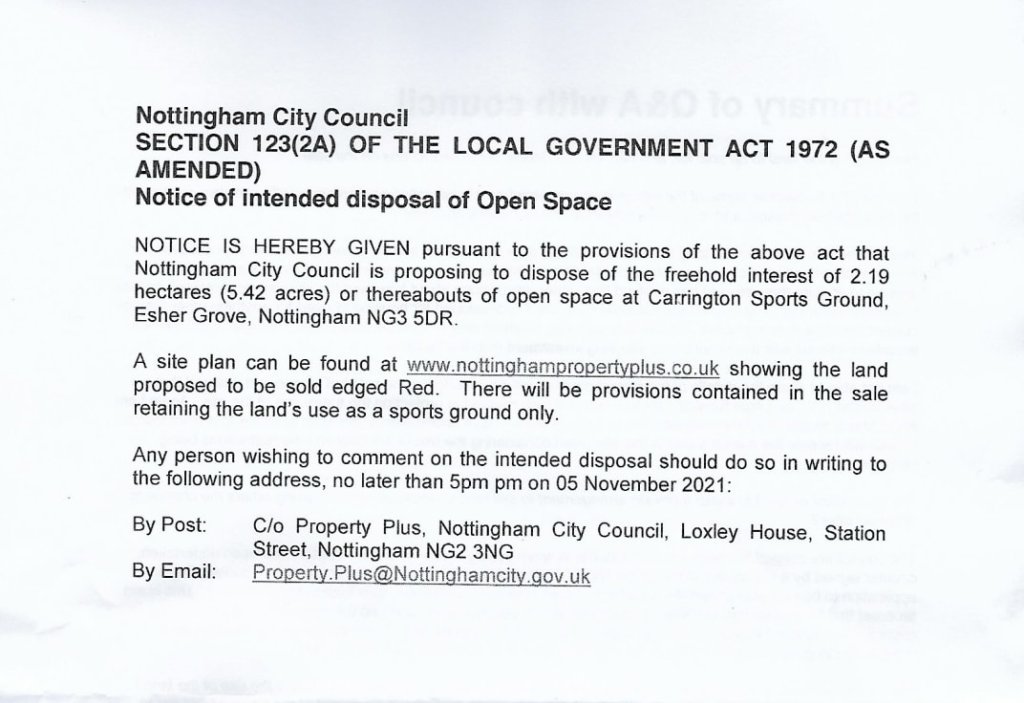 - From Mike Reade (MPRA Commitee): A Notice has been issued by Nottingham City Council (NCC) for the disposal of its freehold interest in Carrington Sports Ground. The sales agency website: https://www.nottinghampropertyplus.co.uk/#consultations has a site plan showing the boundary of the property. Given the ground is part of the Mapperley Park and Alexandra Park Conservation Area, MPRA are of course concerned regarding the sale of the land from our Council to a non-council organisation.We have been in contact with NCC and have received assurance from a NCC Estates Surveyor – Strategic Assets & Property, Growth and City Development Department that ‘The council are not looking to see it redeveloped for housing or used for anything other than its current use as a cricket ground’. However, as the Notice does advise ‘Any person wishing to comment on the intended disposal should do so in writing…’, (by the 5th November 5pm) the MPRA committee will be submitting comments on Mapperley Park Residents behalf. Furthermore, we have been in contact with the NCC Planning Department and, in consultation with a Principal Planning Officer, Growth and City Development, Planning Regeneration and Housing Department, we have drawn up the following list of Nottingham City, Land and Planning Policies, Development Plan Document, Local Plan Part 2 (available at https://www.nottinghamcity.gov.uk/…/the-adopted-local…/) relevant policies which our comments will refer to:DE1: Building Design and Use. Page 101.HE1: Heritage Assets. Page 113.EN3: Playing Fields. Page 145.EN1: Development of Open Space. Page 142.In addition, our Mapperley Park and Alexandra Park Conservation Area, Character Appraisal and Management Plan and was compiled between 2005 and 2007 and included extensive public consultation (available at http://www.nottinghaminsight.org.uk/d/96136). This document refers to the cricket ground as playing fields and as police training grounds in several instances but most importantly, it refers to the unanimous support by the public for the grounds to remain as an open space: page 42 item 15, 15.1 and 15.2. Please remember, that we have been advised that it is NOT the intention of NCC to sell the land for any purpose other than to ensure the continued use of the property as a cricket ground with associated pavilion. We are not likely to be party to the particulars of the Freehold contract and therefore we must rely on NCC to ensure that suitable legal wording be used in the agreement ensuring the long-term retention of the grounds and pavilion as community assets and open space for the benefit of the people of Nottingham. Comments on the disposal of the pavilion and grounds can be made in writing to C/o Property Plus, Nottingham City Council, Loxley House, Station Street, Nottingham NG2 3NG or by email to Property.Plus@Nottinghamcity.gov.uk or you can contact our Local Councillors, their details are available at https://nottinghamcity.gov.uk/…/council…/mapperley/.